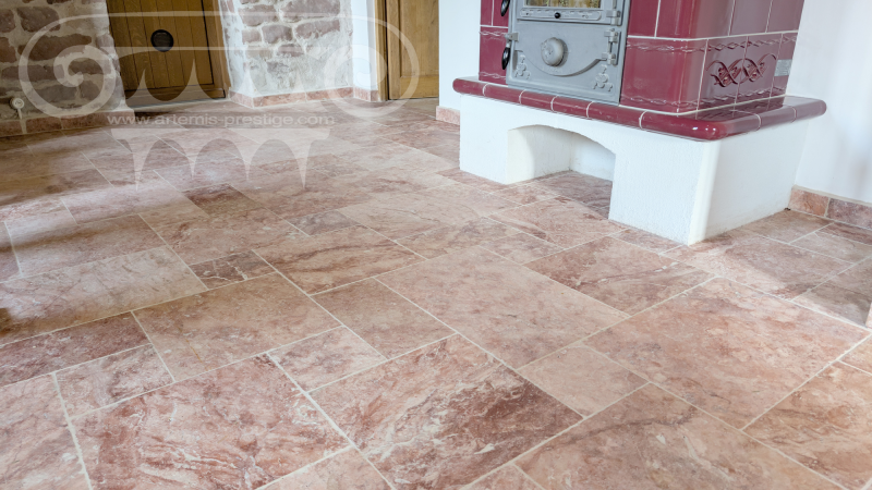 Un Travertin d'un rose somptueux, un ton très chaleureux, idéal pour sublimer vos terrasses et vos cuisines d'été. Parmi les pierres de travertins que nous proposons chez Artemis, le travertin Rosso est définitivement l'une des plus belle.